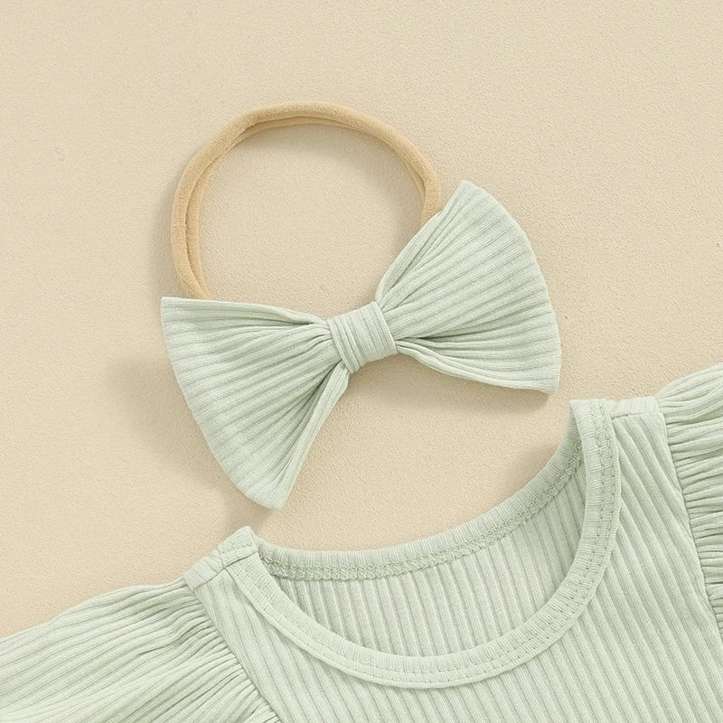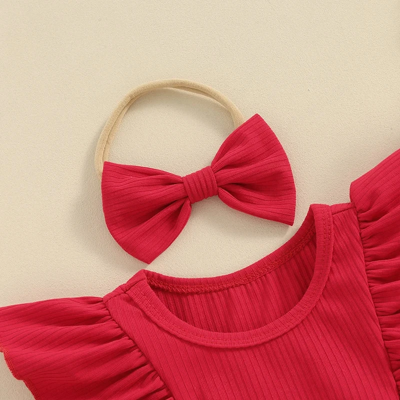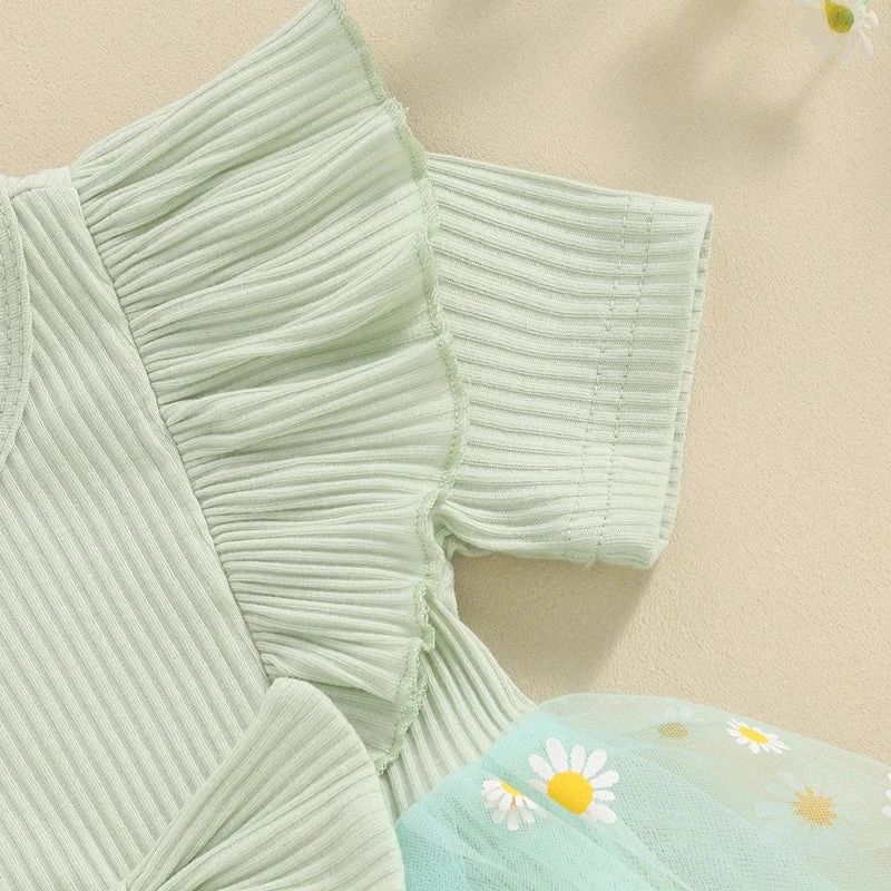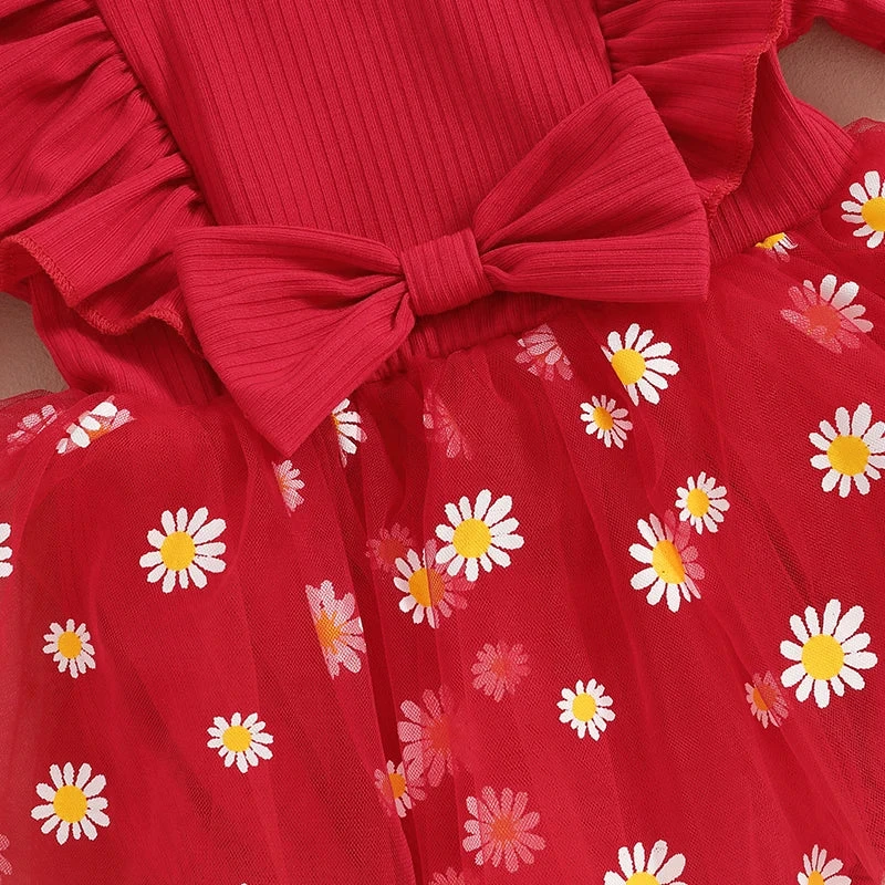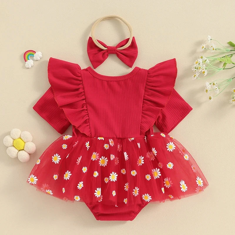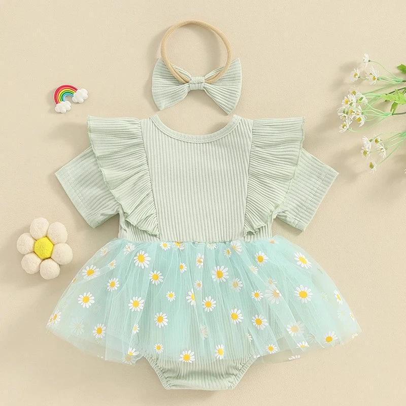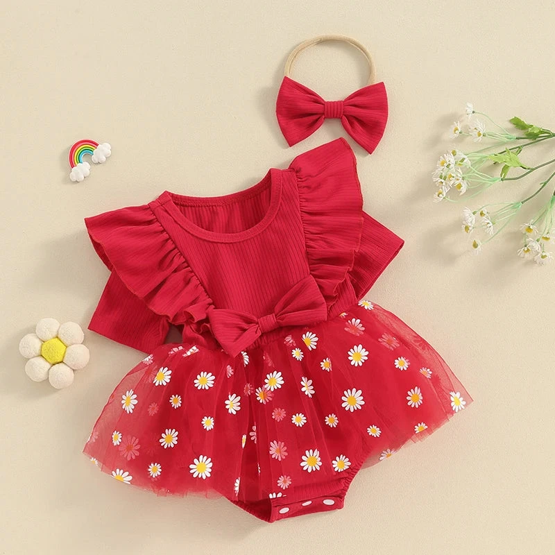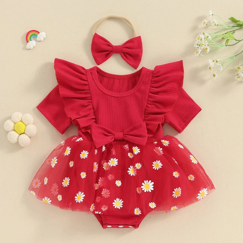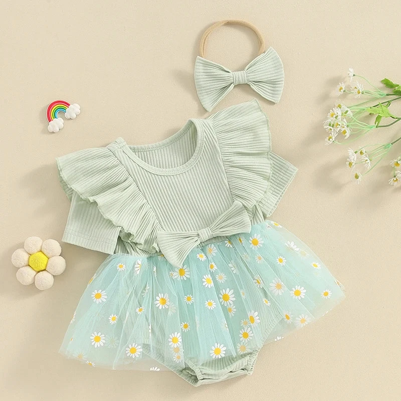 This is a 2-piece set for baby and toddler girls featuring a short sleeve ruffle ribbed bow dress with a charming daisy flower print and matching headband. Made from a soft cotton blend, it combines sweet floral patterns with delicate ruffles and an adorable bow accent. The coordinating headband completes the look, making it perfect for spring and summer days. It solves the challenge of finding a coordinated outfit that’s both playful enough for everyday fun and cute enough for special occasions.