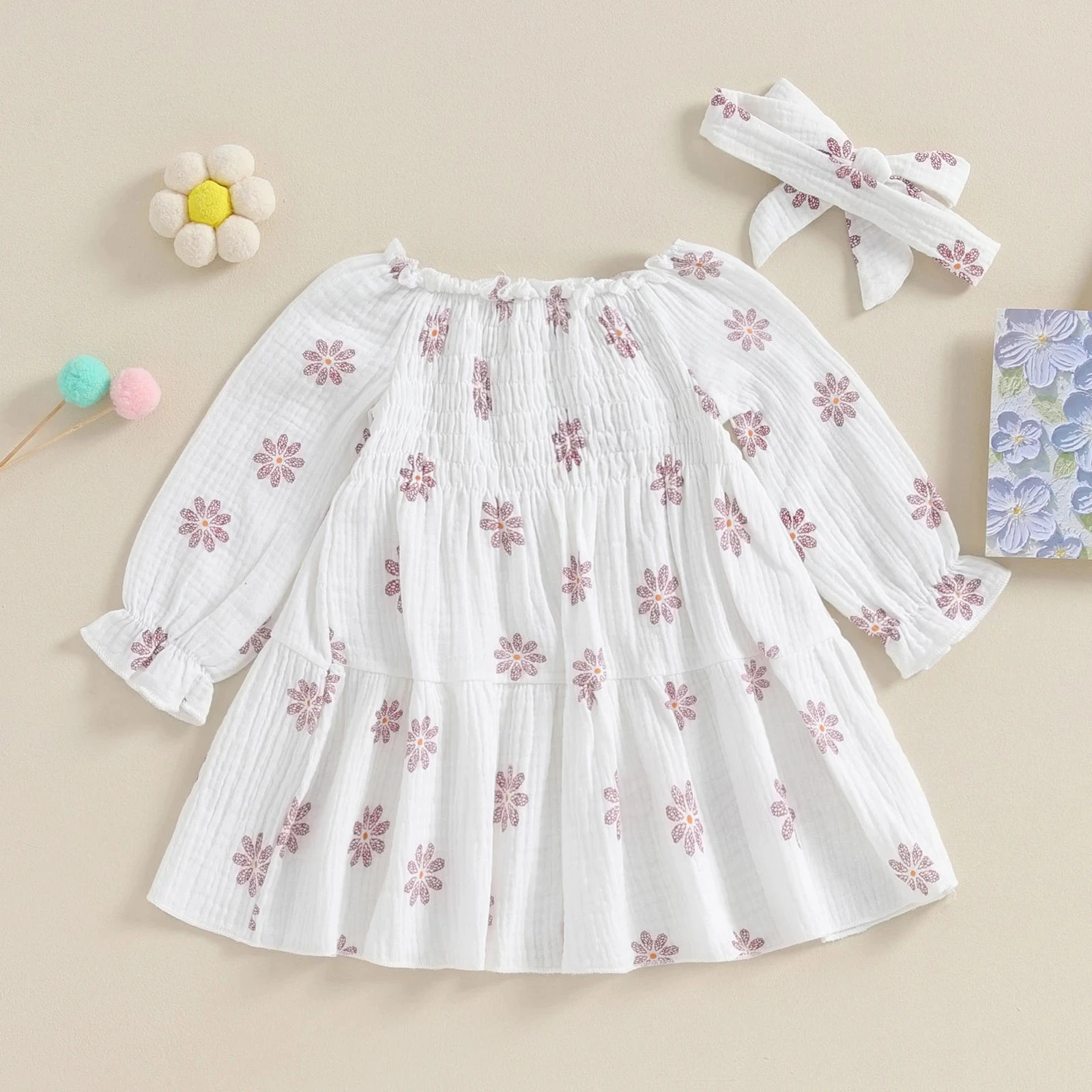 This is a 2-piece boho-style set for baby and toddler girls who love free-spirited, floral style. Featuring a long sleeve floral print dress with a matching bow, it captures the essence of bohemian charm while keeping little ones cozy and comfortable. The long sleeves make it perfect for cooler days or transitioning between seasons, while the coordinating bow adds a sweet finishing touch. It solves the challenge of finding a coordinated outfit that’s both stylish enough for photos and practical enough for everyday adventures.