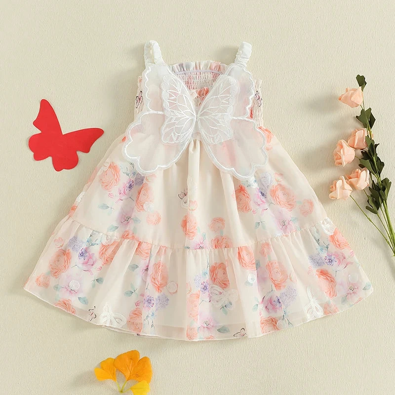 This is a sleeveless floral butterfly print dress for toddler girls who love whimsical, nature-inspired style. Made from soft polyester, it features a beautiful combination of delicate florals and fluttering butterflies that create a magical, garden-fresh design. Perfect for warm-weather days, it solves the challenge of finding a dress that’s both playful enough for everyday adventures and pretty enough for special moments.