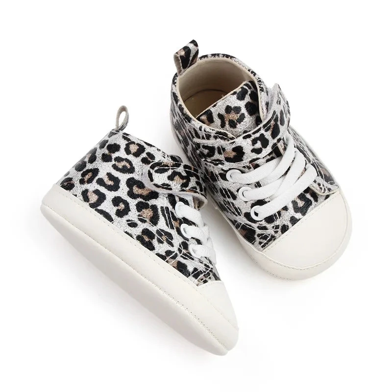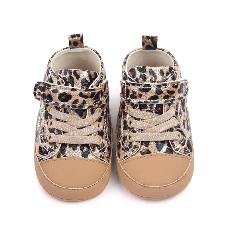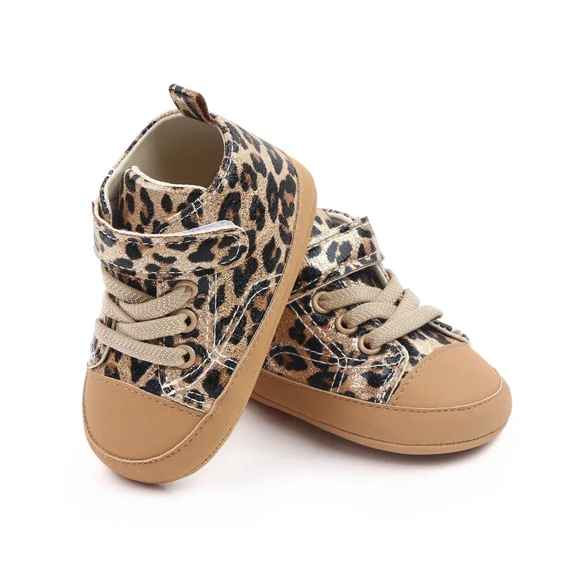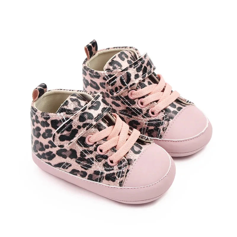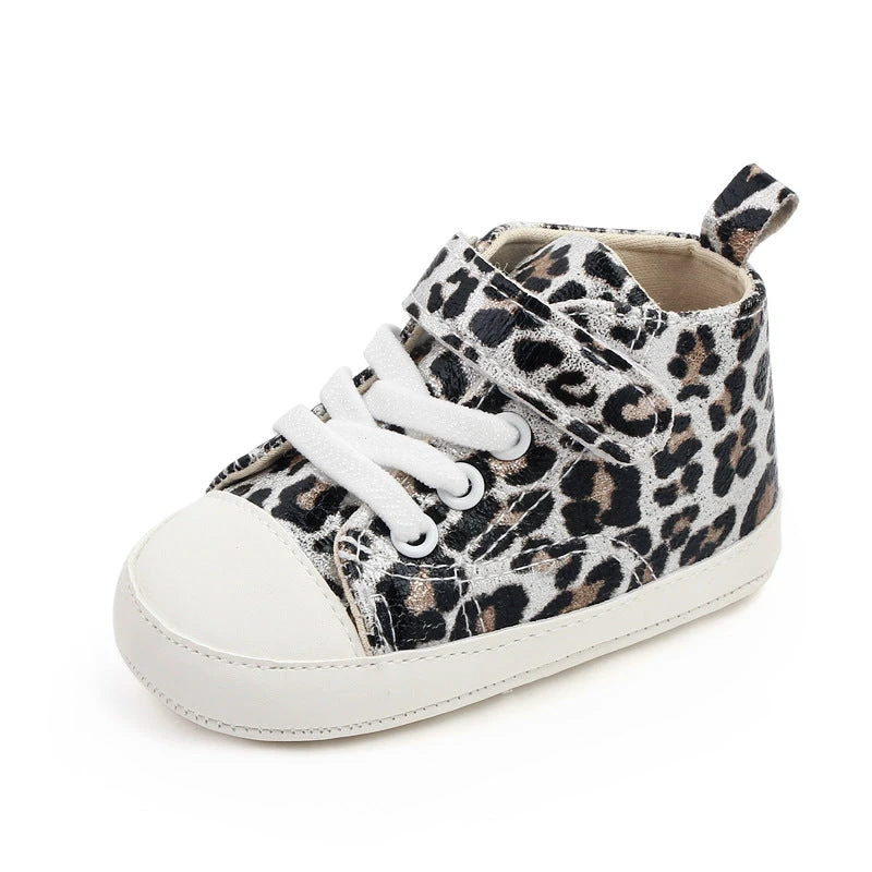 These are leopard print strap lace shoes for baby and toddler girls who love wild, trendy style. Made from soft cotton and canvas, they feature a bold leopard print pattern with secure strap lace closure. Available in three sizes from 0-6 months through 12-18 months with detailed insole measurements, they solve the challenge of finding shoes that are both fashionable enough for mini fashionistas and comfortable enough for little feet.