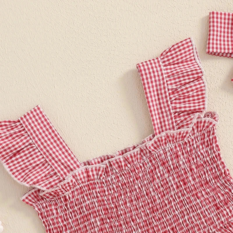 Style: Sleeveless ruffle plaid strawberry print dress with matching bow (2-piece set)