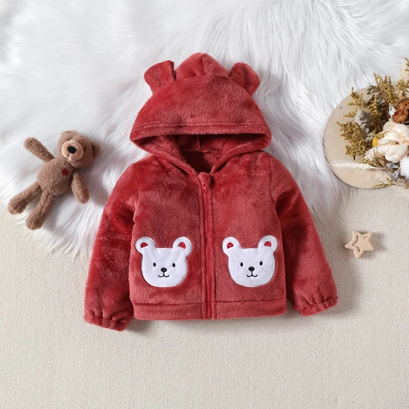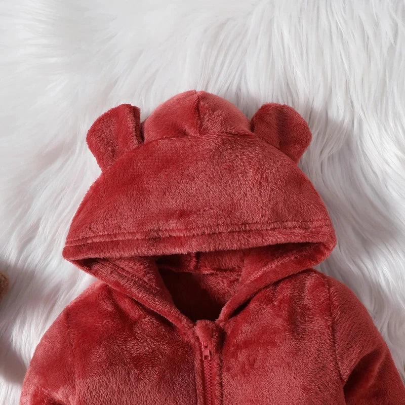 Features: Plush texture, bear design, zip-up hoodie