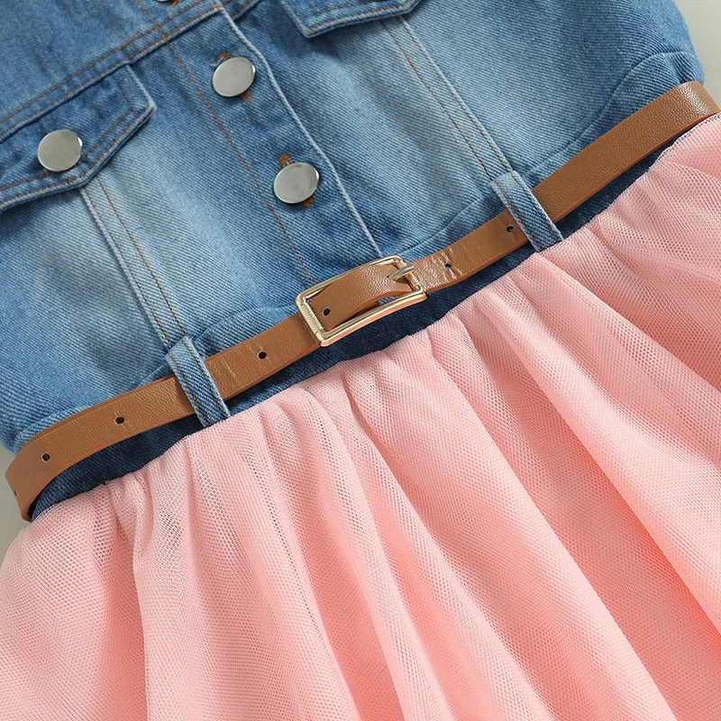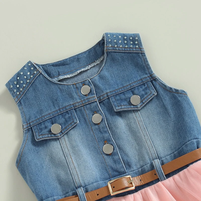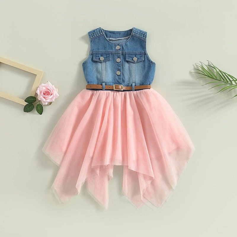 This is a sleeveless denim belted dress with an irregular hemline for toddler girls who love trendy, fashion-forward style. Made from a soft cotton blend, it features classic solid denim with a detachable belt to cinch the waist and a unique irregular cut that adds modern flair. The sleeveless design keeps little ones cool during warm weather, while the belted detail allows for customizable styling. It solves the challenge of finding a dress that’s both durable enough for everyday play and stylish enough to stand out from basic denim styles.