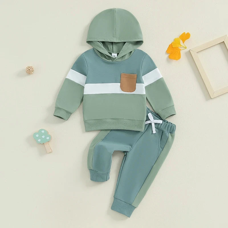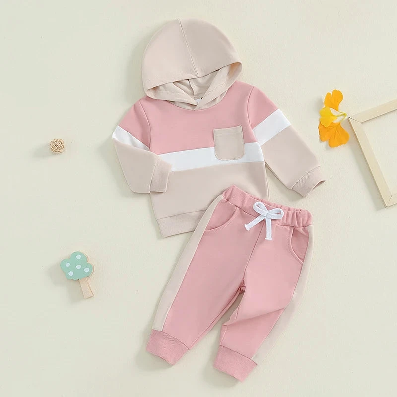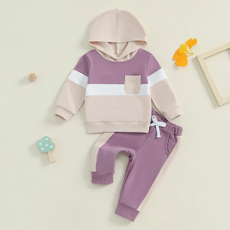 This is a 2-piece outfit set for baby and toddler boys and girls featuring a cozy long-sleeve stripe color patch hoodie with matching pants. Made from a soft cotton blend, it’s perfect for keeping little ones warm and stylish during cooler weather. The fun color patches on the hoodie add a playful touch, while the coordinated stripes create a cohesive look. It solves the challenge of finding a unisex outfit that’s both comfortable enough for everyday play and cute enough for family outings.